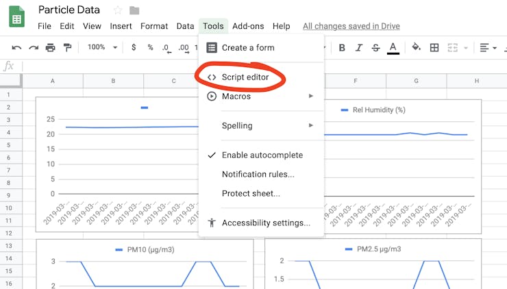 Save - If your Particle is programmed, you should start seeing updated data populate the Google Sheet. You can put data into graphs that update in real time.