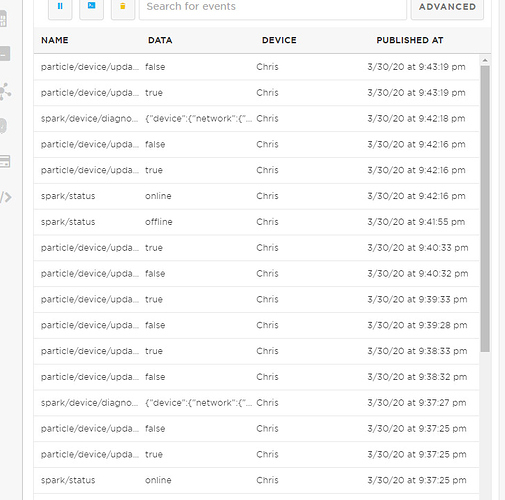 Yes it shows, as you can see I get updates from the events, although clicking the exclamation mark only makes the colours in the WEBIDE cycle, the argon keeps breathing cyan. Forgot to say, it also goes from breathing cyan to flashing cyan like it’s trying to get a connection to the cloud server.
