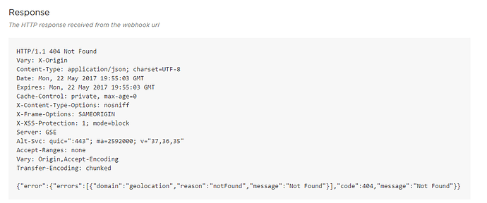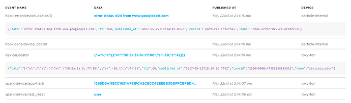 I am using the Sample Firmware APP in an attempt to obtain geolocation coordinates from my Photon. The Photon is connected to my home’s wireless network. I am getting the Error Status 404 message which the tutorial specifically mentions as meaning that Google is unable to determine the coordinates. However, I’m uncertain as to why this is the case. One thing I noticed is that in the log for the hook-sent/deviveLocator item, rather than it saying “undefined”, it is simply blank. I can click on the blank field to reveal more detail as you will see in the attached. Perhaps everything is performing as expected and for whatever reason, Google can’t determine my coordinates. I guess I’m just wondering why.