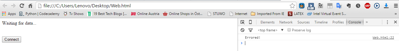 Thanks a lot! I am now getting the HTML file to work and show the Connect button. It turns blue on click but then nothing happens. I brought up the Javascript console window but the message I get isn’t helpful to me: Uncaught SyntaxError: Unexpected token ILLEGAL
